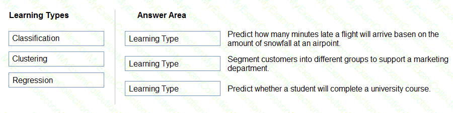 To answer, drag the appropriate machine learning type from the column on the left to its scenario on the right. Each machine learning type may be used once, more than once, or not at all.
