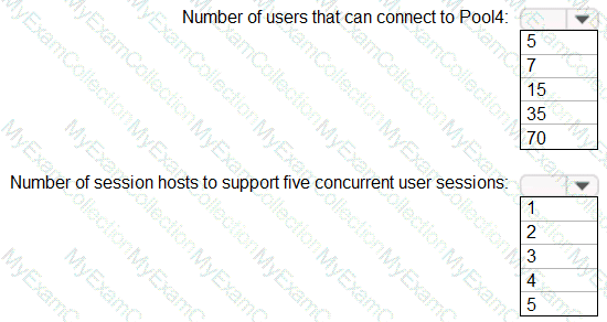 What will be the maximum number of users that can connect to Pool4, and how many session hosts are needed to support five concurrent user sessions? To answer, select the appropriate options in the answer area.
