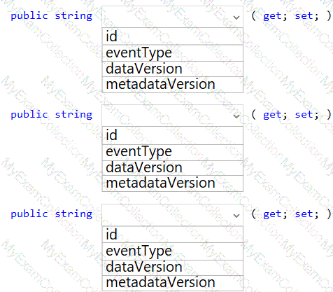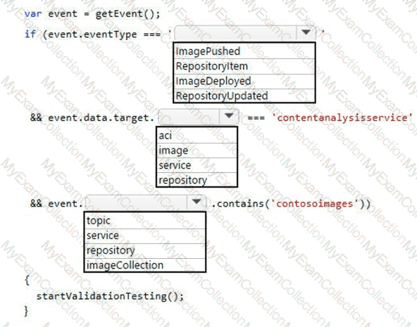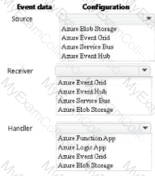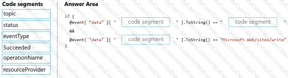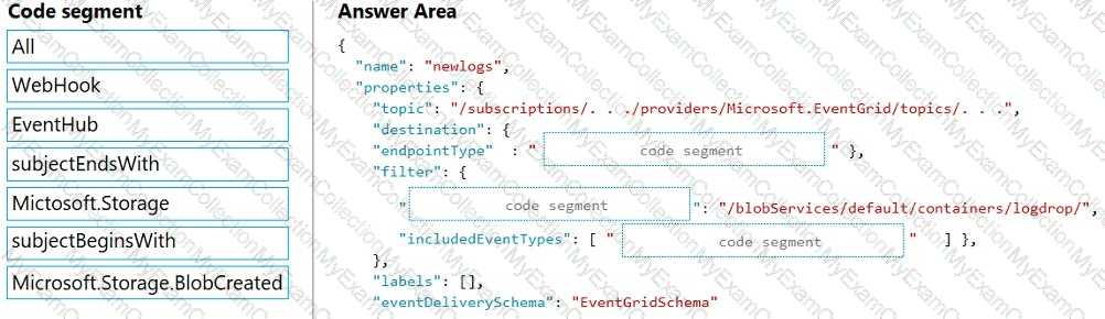 How should you complete the Azure Event Grid subscription? To answer, drag the appropriate JSON segments to the correct locations. Each JSON segment may be used once, more than once, or not at all. You may need to drag the split bar between panes to view content.