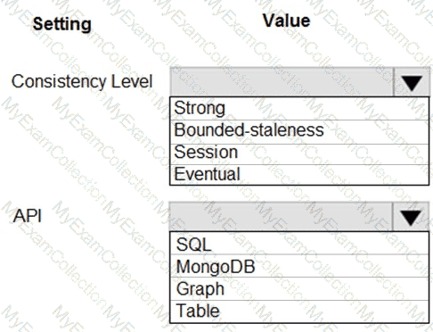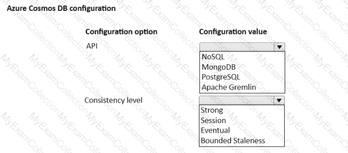 Which Azure Cosmos DB configuration should you use? To answer, select the appropriate options in the answer area.