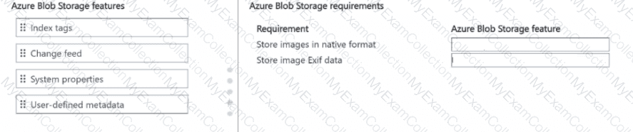 Which Azure Blob Storage feature should you use? To answer, move the appropriate Azure Blob Storage features to the correct requirements. You may use each Azure Blob Storage feature once, more than once, or not at all. You may need to move the split bar between panes or scroll to view content
