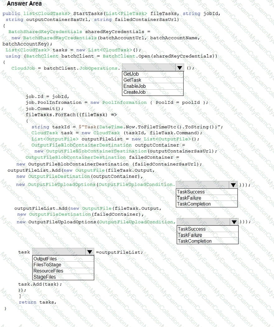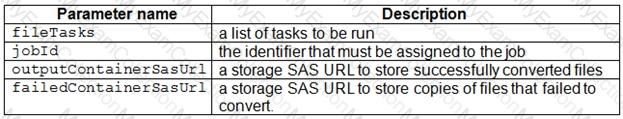 You have an Azure Batch project that processes and converts files and stores the files in Azure storage. You are developing a function to start the batch job.
