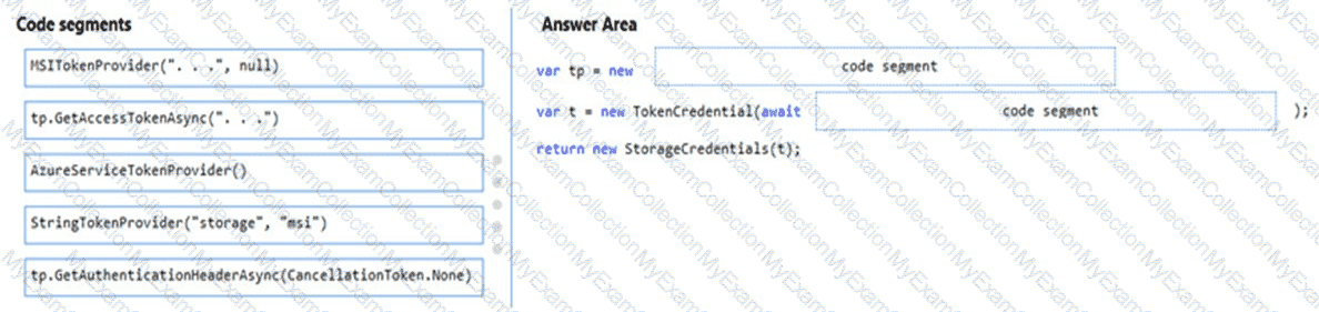 How should you complete the code segment? To answer, drag the appropriate code segments to the correct locations. Each code segment may be used once, more than once, or not at all. You may need to drag the split bar between panes or scroll to view content.
