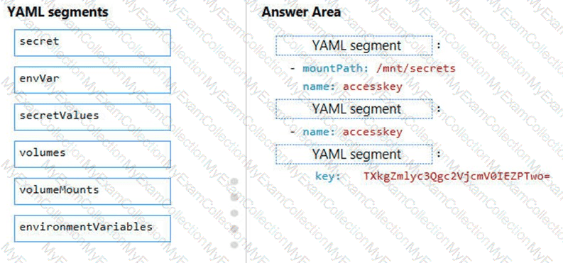 How should you complete the YAML markup? To answer, drag the appropriate YAML segments to the correct locations. Each YAML segment may be used once, more than once, or not at all. You may need to drag the split bar between panes or scroll to view content.