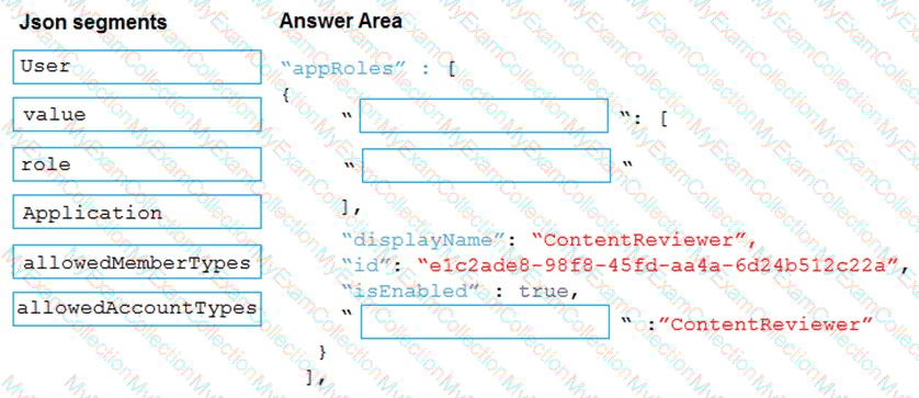 How should you complete the markup? To answer, drag the appropriate json segments to the correct locations. Each json segment may be used once, more than once, or not at all. You may need to drag the split bar between panes or scroll to view content.
