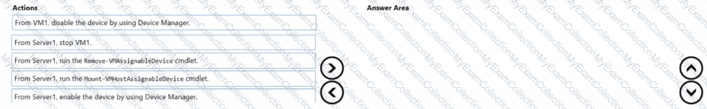 Server1 hosts a virtual machine named VM1. Server1 has an NV Me storage device that is assigned to VM1 by using Discrete Device Assignment.