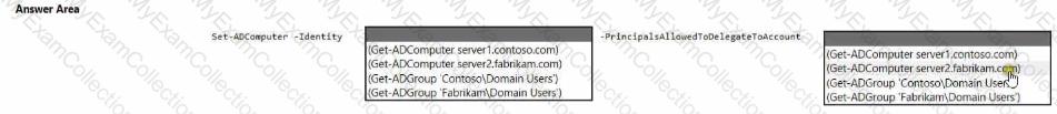 You need to configure resources based constrained delegation so that the users In contoso.com can use Windows Admin Center on Server) to connect to Server? How should you complete the command? To answer, select the appropriate options in the answer area. NOTE: Each correct selection is worth one point.