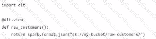 A Data Engineer is building a simple data pipeline using Delta Live Tables (DLT) in Databricksto ingest customer data. The raw customer data is stored in a cloud storage location in JSON format. The task is to create a DLT pipeline that reads the rawJSON data and writes it into a Delta table for further processing.