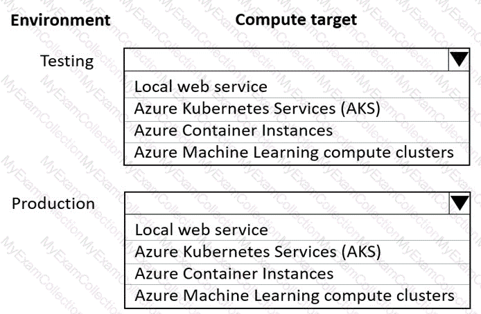The compute target for testing must minimize cost and deployment efforts. The compute target for production must provide fast response time, autoscaling of the deployed service, and support real-time inferencing.