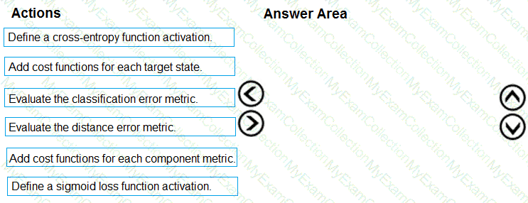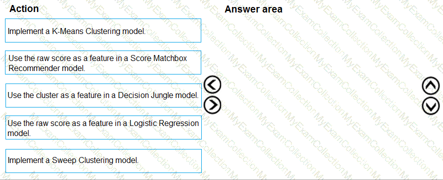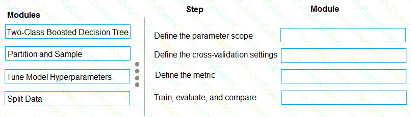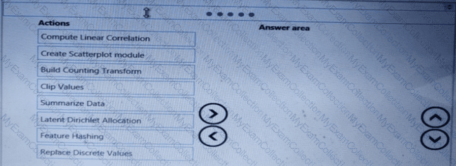 Which three Azure Machine Learning Studio modules should you use in sequence? To answer, move the appropriate modules from the list of modules to the answer area and arrange them in the correct order.