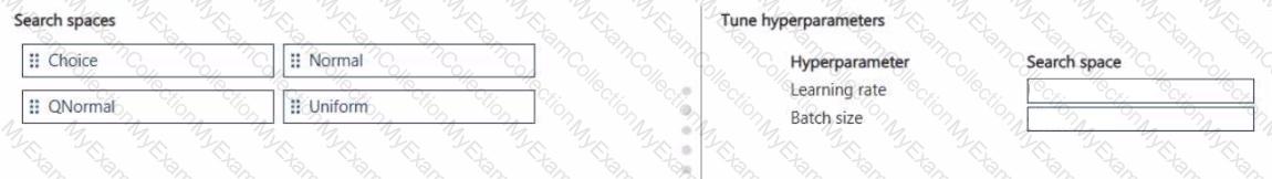 Which search space should you use? To answer, move the appropriate search spaces to the correct hyperparameters. You may use each search space option once, more than once, or not at all. You may need to move the split bar between panes or scroll to view content.