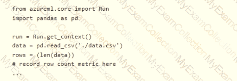 You need to record the row count as a metric named row_count that can be returned using the get_metrics method of the Run object after the experiment run completes. Which code should you use?