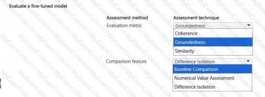 You need to identify an evaluation metric and a comparison feature to assess the performance of the model. Which assessment techniques should you use? To answer, select the appropriate options in the answer area.
