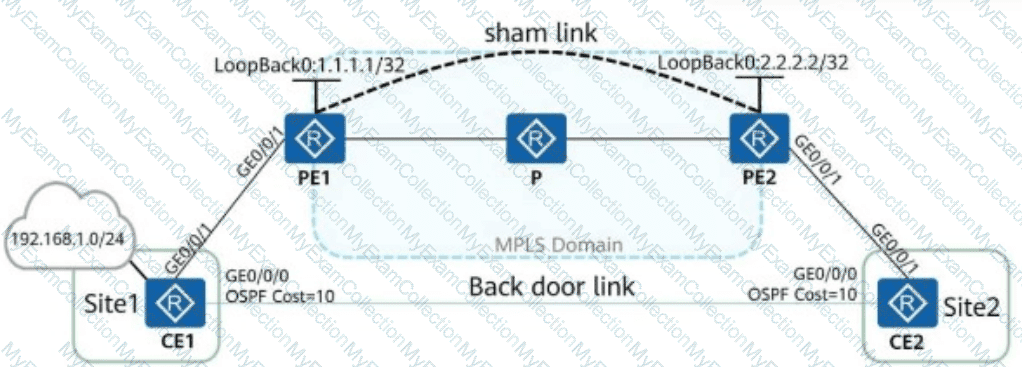 As shown in the figure, a sham link is established between PE1 and PE2 through the loopback interfaces. CE2 can learn the 192.168.1.0/24 route (directed route on CE1) through the sham link and backdoor link. If other parameters use their default settings, the cost of the 192.168.1.0/24 route on CE2 should be ______. (Enter an Arabic numeral without symbols.)
