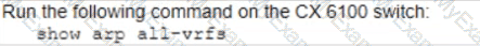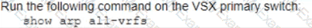 You are troubleshooting an issue with a pair of Aruba CX 8360 switches configured with VSX Each switch has multiple VRFs. You need to find the IP address of a particular client device with a known MAC address You run the "show arp" command on the primary switch in the pair but do not find a matching entry for the client MAC address.