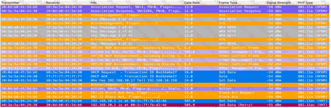 A customer is reporting mat connectivity is Tailing for some wireless client Devices. What are your conclusions from the capture? (Select two.)