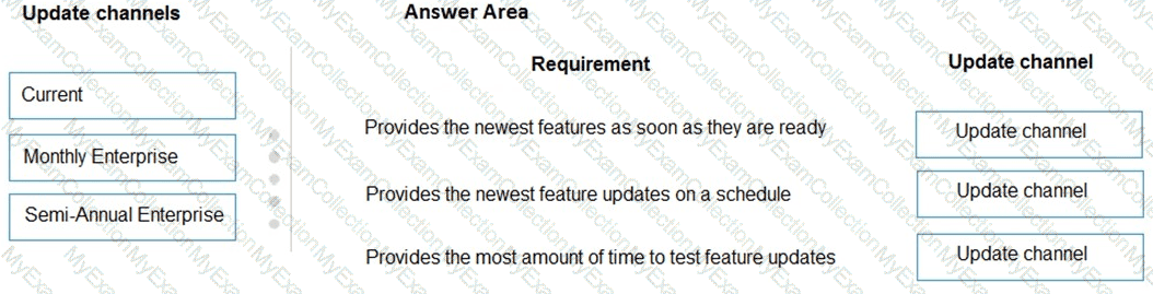 Which update channel should you use for each requirement? To answer, drag the appropriate update channels to the correct requirements. Each update channel may be used once, more than once, or not at all. You may need to drag the split barbetween panes or scroll to view content.