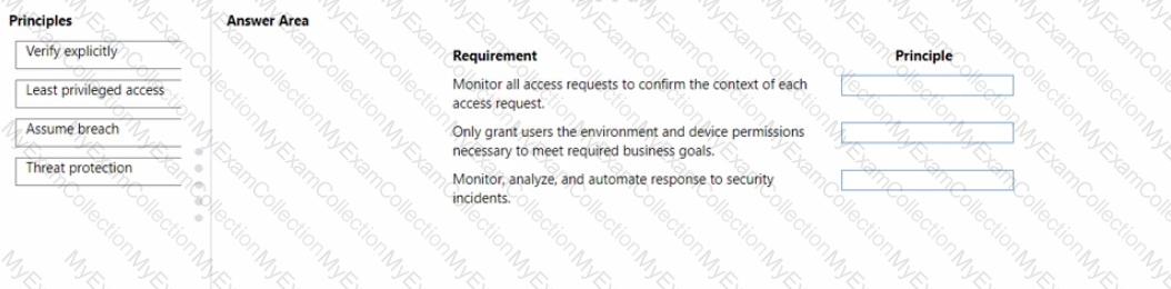 Which Zero Trust security principle should yourecommend? To answer, drag the appropriate principles to the correct requirements. Each principle may be used once, more than once, or not at all. You may need to drag the split bar between panes or scroll to view content
