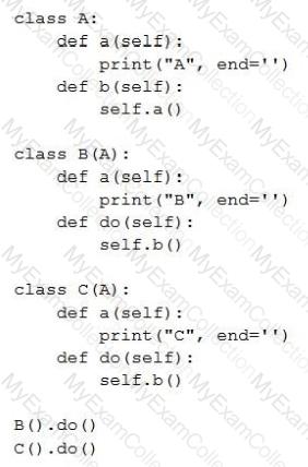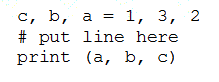 Which line can be used instead of the comment to cause the snippet to produce the following expected output? (Select two answers)
