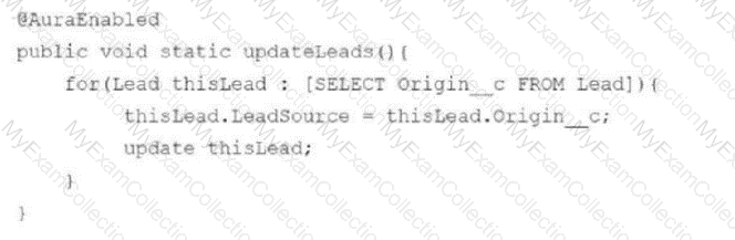 The following code snippet is executed by a Lightning web component in an environment with more than 2,000 lead records:
