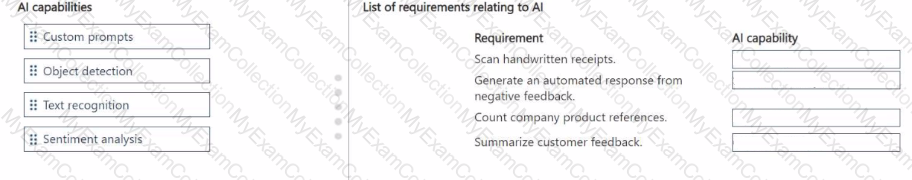 A company is evaluating Al capabilities in Microsoft Power Platform. The company requires fulfillment of the following tasks: