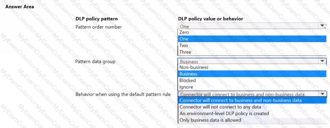 You need to identify the values or the behavior for the pattern added to the tenant Microsoft Power Platform data loss prevention (DIP) policy.
