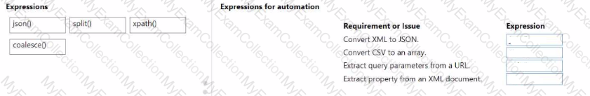 Which expressions should you use to address the requirements and issues? To answer, move the appropriate expression to the correct requirement or issue. You may use each expression once, more than once, or not at all. You may need to move the split bar between panes or scroll to view content.