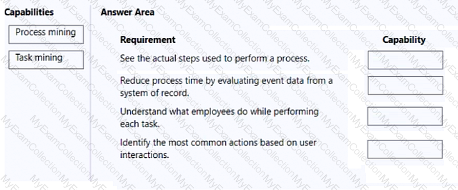 Which Process advisor capability should you use? To answer, drag the appropriate capabilities to the correct requirements. Each capability may be used once, more than once, or not at all. You may need to drag the split bar between panes or scroll to view content.