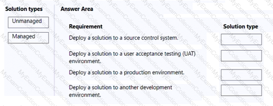 Which type of solutions should you create? To answer, drag the appropriate solution types to the correct requirements. Each solution type may be used once, more the once, or not at all. You may need to drag the split bar between panes or scroll to view content.