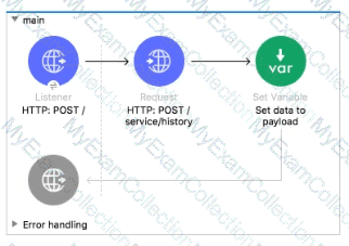 Refer to the exhibits. A web client sends a POST request to the HTTP Listener and the Validation component in the Try scope throws an error.