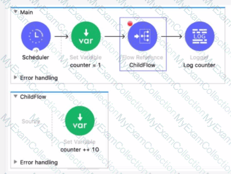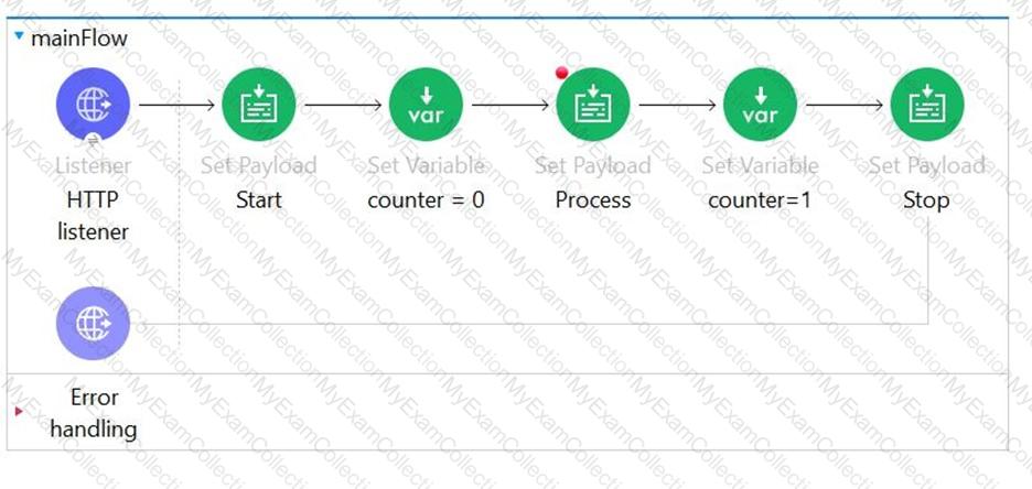 Refer to the exhibits. The Mule application isstopped at the breakpoint in Anypoint Studio. A watch expression Is set to the counter variable.