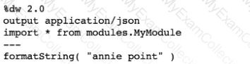 A Mule project contains a DataWeave module called MyModule.dwl that defines a function named formatString. The module is located in the project's src/main/resources/modules folder.