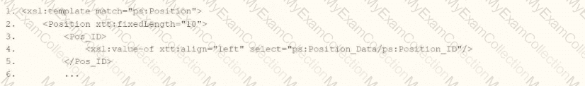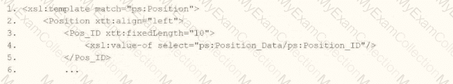 This applies xtt:fixedLength="10" to the xsl:template element and xtt:align="left" to Pos_ID. Similar to option B, XTT attributes must be applied to the specific element (Pos_ID) being formatted, not the template itself, making this incorrect.