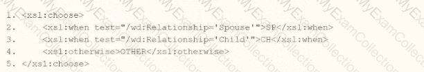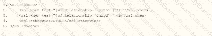Context in Template: Since the template matches on wd:Dependents_Group, the test conditions operate on the current wd:Dependents_Group element and its attributes, ensuring the correct relationship code is output for each dependent. The XML snippet shows wd:Relationship as an element, but Workday documentation and integration practices often standardize it as an attribute in XSLT transformations, making @wd:Relationship appropriate.