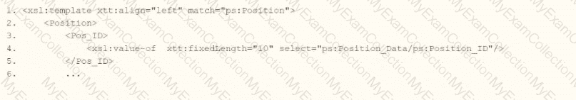 xtt:fixedLength="10" specifies that the Pos_ID field should be formatted to a fixed length of 10 characters. If the ps:Position_ID value exceeds 10 characters, it will be truncated (by default, XTT truncates without raising an error unless explicitly configured otherwise), meeting the requirement to truncate if the value exceeds.