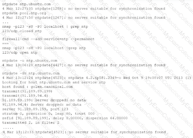 An administrator is unable to sync servers to the new NTP server IP address given by the service provider despite several attempts. Looking at the below output