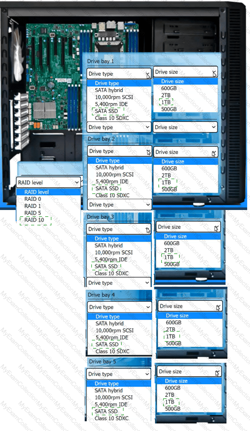 Use the drop-down menus to select the appropriate RAID level, drive types, and drive sizes based on the requirements above. For each drive type that is selected, a corresponding drive size must also be selected.