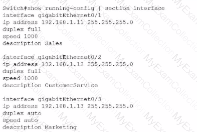Marketing department users report network performance degradation in the morning and early afternoon, but sales and customer service department users do not report any issues. All structured cabling Is Cat 5e. All departments are connected to a core switch. The running network configuration shows the following: