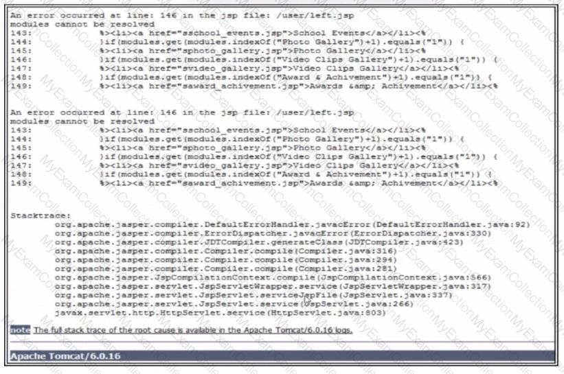 Refer to the exhibit. A penetration test performed against a web application generates the error message. Which two pieces of information are exposed? (Choose two.) Q Internal paths of the web server