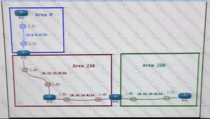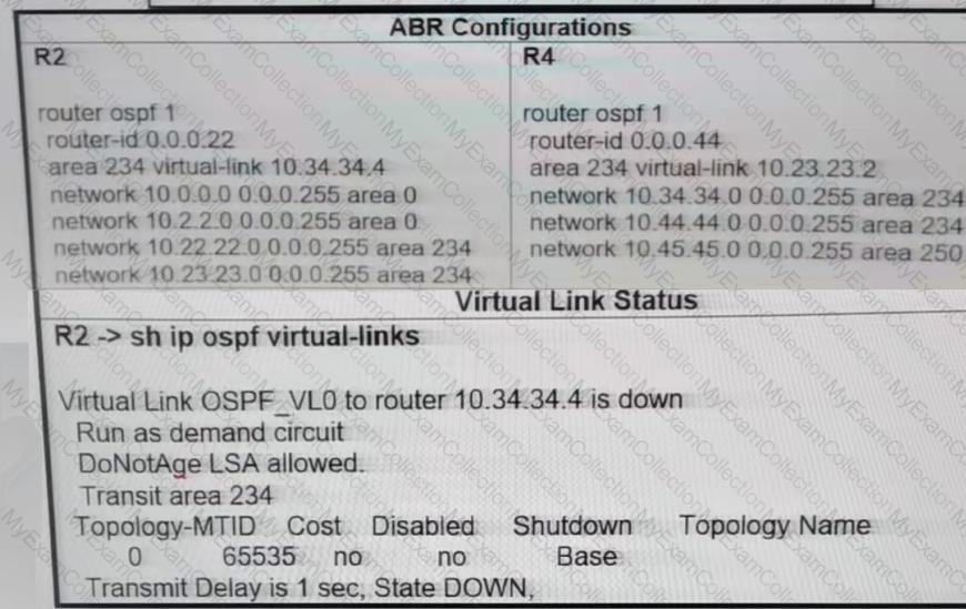 The network administrator configured the network to connect two disjointed networks and ail the connectivity is up except the virtual link which causes area 250 to be unreachable. Which two configurations resolve this issue? (Choose two.)