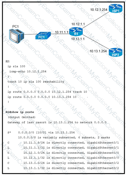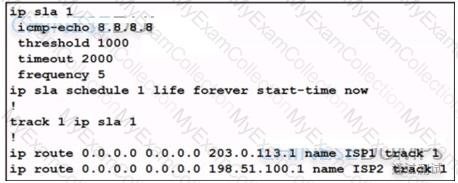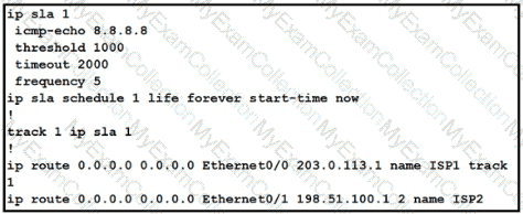 An engineer is monitoring reachability of the configured default routes to ISP1 and ISP2. The default route from ISP1 is preferred if available. How is this issue resolved?