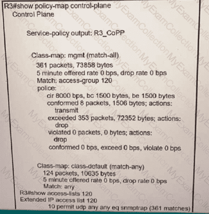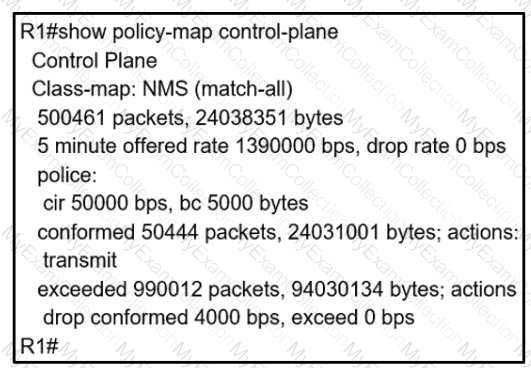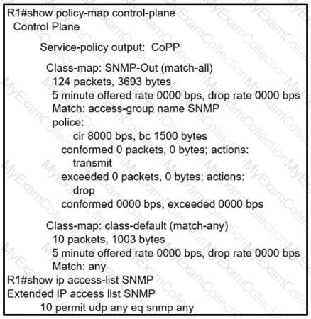 The network administrator configured CoPP so that all SNMP traffic from Cisco Prime located at 192.168.1.11 toward the router CPU is limited to 1000 kbps. Any traffic that exceeds this limit must be dropped.