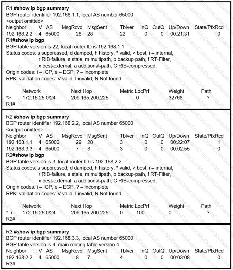 R2 is a route reflector, and R1 and R3 are route reflector clients. The route reflector learns the route to 172.16.25.0/24 from R1, but it does not advertise to R3. What is the reason the route is not advertised?
