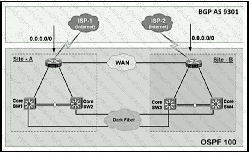 The Internet traffic should always prefer Site-A ISP-1 if the link and BGP connection are up; otherwise, all Internet traffic should go to ISP-2 Redistribution is configured between BGP and OSPF routing protocols and it is not working as expected. What action resolves the issue?