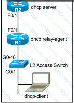 The network administrator can see the DHCP discovery packet in R1. but R2 is not replying to the DHCP request. The R1 related interface is configured with the DHCP helper address. If the PC is directly connected to the FaO/1 interface on R2, the DHCP server assigns as IP address from the DHCP pool to the PC. Which two commands resolve this issue? (Choose two.)