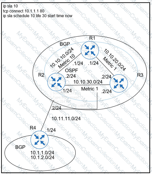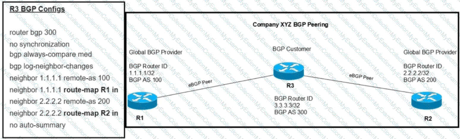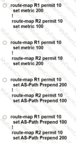 Refer to the exhibit. R3 is dual-homed to two service providers for traffic redundancy. R3 prefers its outbound traffic via R2. Which set of configurations achieves this goal?