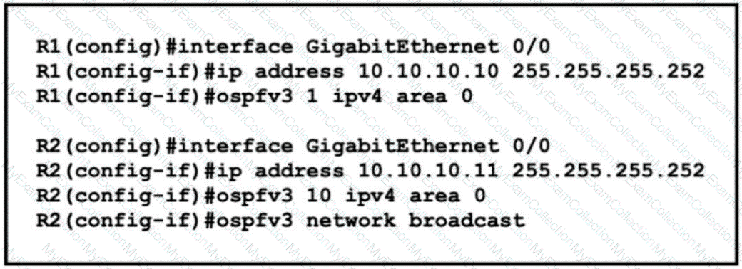 Refer to the exhibit An engineer is troubleshooting an OSPF adjacency issue between directly connected routers R1 and R2 Which configuration resolves the issue?