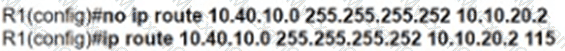 An IP SLA is configured to use the backup default route when the primary is down, but it is not working as desired. Which command fixes the issue?