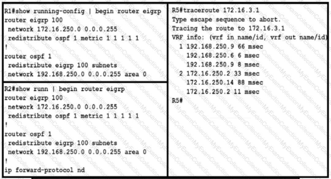 Routing protocols are mutually redistributed on R3 and R1. Users report intermittent connectivity to services hosted on the 10.1.1.0/24 prefix. Significant routing update changes are noticed on R3 when the show ip route profile