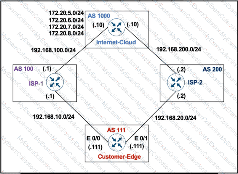 AS 111 wanted to use AS 200 as the preferred path for 172.20.5.0/24 and AS 100 as the backup. After the configuration, AS 100 is not used for any other routes. Which configuration resolves the issue?